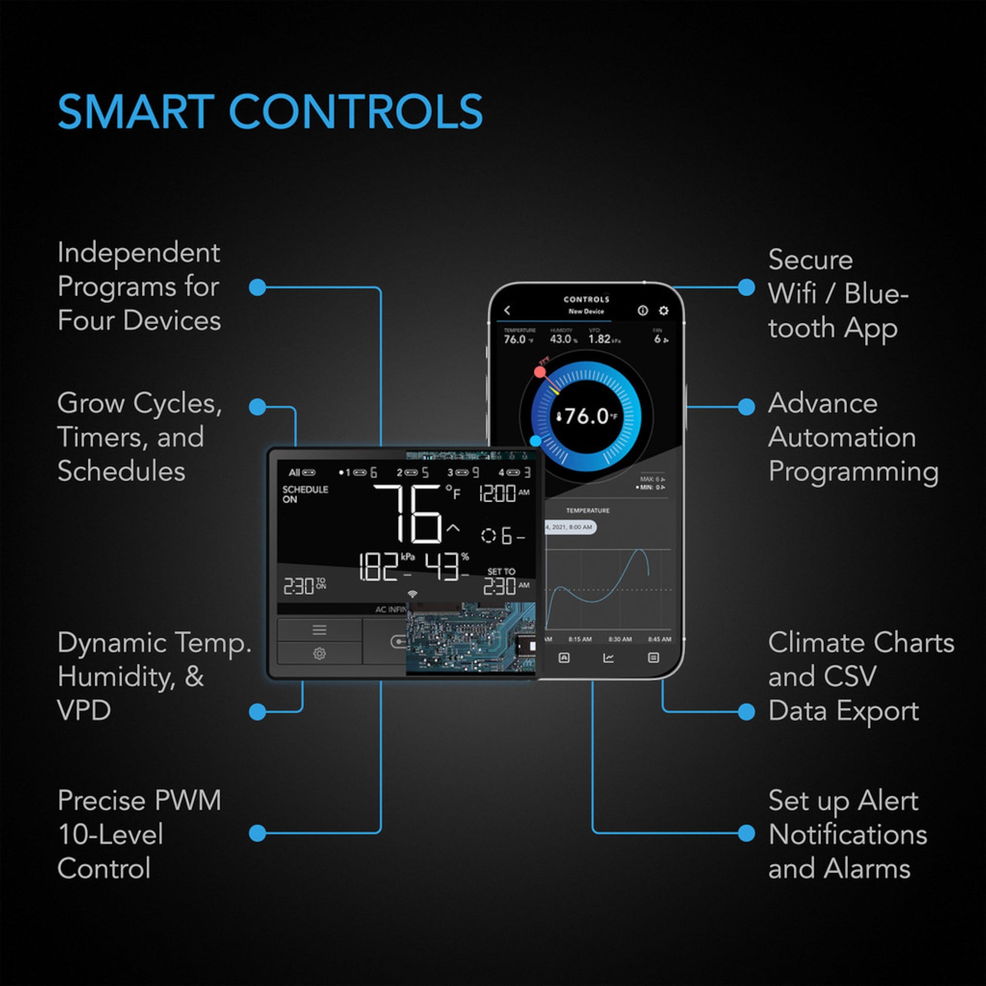 At the heart of the system is the state-of-the-art CONTROLLER 69 PRO, a central hub engineered to synchronize and manage all your grow devices seamlessly. This innovative controller offers dynamic programming capabilities, responding to VPD (vapor pressure deficit) levels, temperature, and humidity to create a perfectly balanced growing environment. With timer, cycle, and schedule modes, you have the flexibility to customize on-demand activation for various indoor growing needs. Plus, the secure AC Infinity app connectivity via WiFi allows you to monitor and control your system remotely, providing peace of mind and unparalleled convenience with access to advanced programs, alerts, notifications, and historical charts.